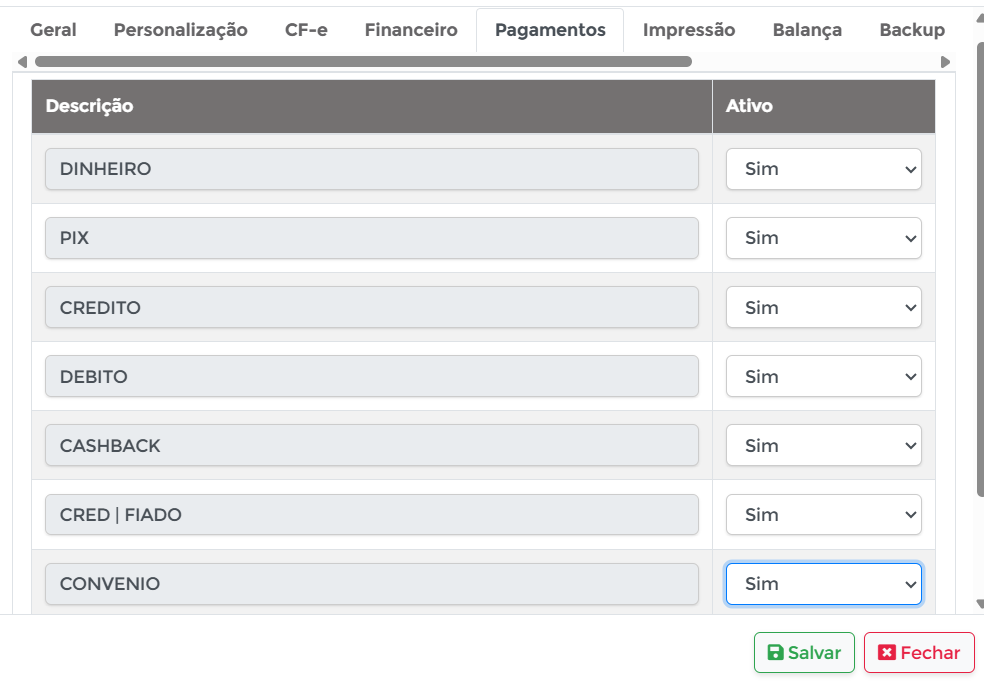 Lá você verá todas as formas de pagamento habilitadas, como débito, crédito, Pix, dinheiro etc.